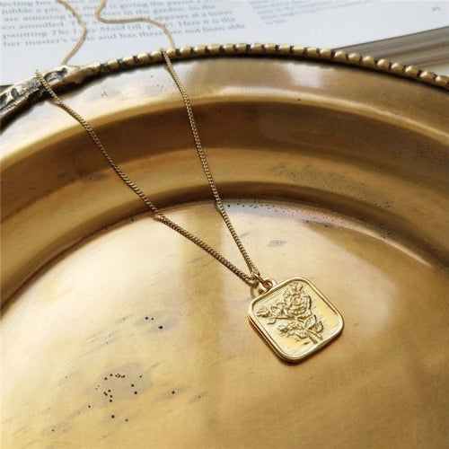 FLORA - Vintage gold square necklace, rounded corners gold coin pendant flower necklace boho long stacking necklace floral 925 silver