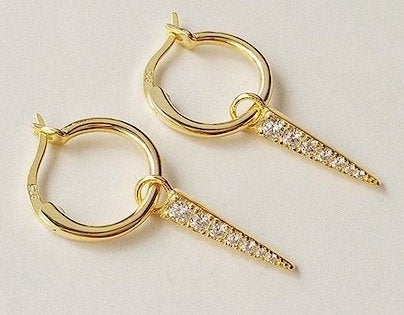 CZ pointy hoop, gold spike charm, dainty huggie earring, dangling cubic zirconia, gold dagger earring, sharp triangle, pointy pyramid, 925